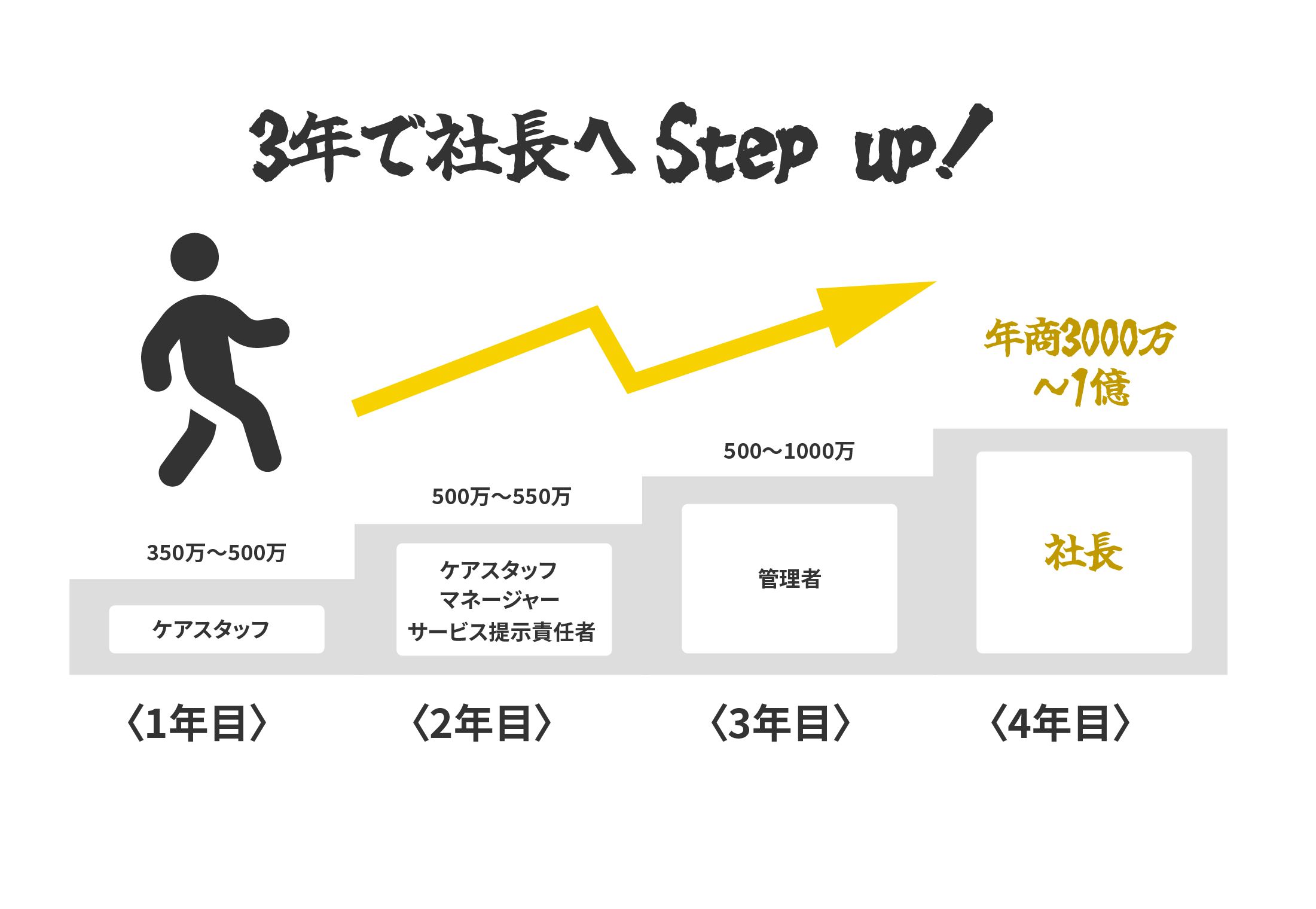 笑グループでは、学歴・年齢・経験を問わず、誰にでもチャンスがあります。全スタッフが年収1,000万円を目指せる仕組みを整え、一人ひとりの「なりたい自分」を応援します。
